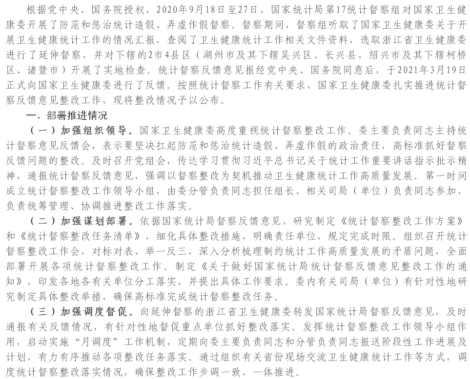 国家卫生健康委关于防范和惩治统计造假弄虚作假督察整改工作情况的报告