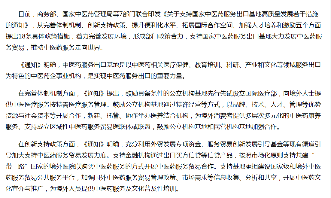 商务部、国家中医药局等7部门联合印发通知:支持国家中医药服务出口基地发展