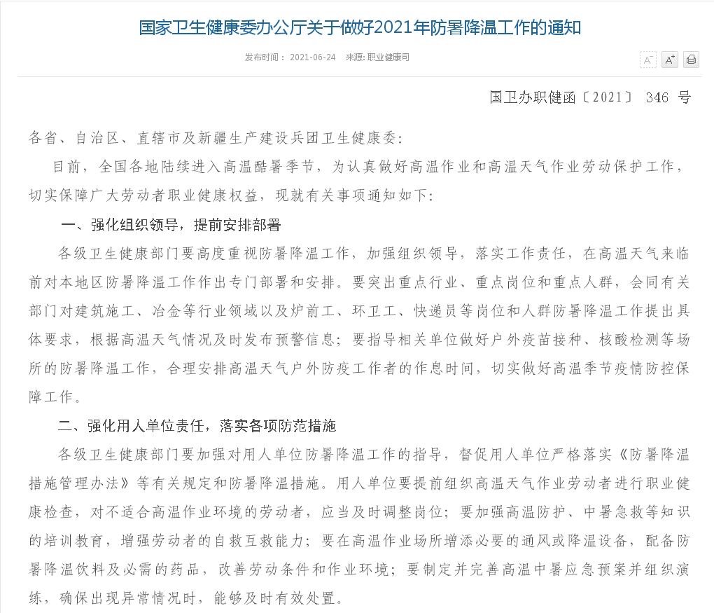 国家卫生健康委办公厅关于做好2021年防暑降温工作的通知