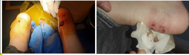 由于长时间在水里浸泡和行走,第一天任务结束后赵彦峰的双脚磨出了水泡。简单处理伤口、贴上创可贴,他又坚持执行了第二天、第三天的运送任务、第四天的搜救任务,然而长期浸泡、笨重的救援靴都加速着伤口的溃烂,第四天任务结束时,他的双脚开始浮肿,甚至没有办法穿鞋,最终赵彦峰在队友的劝阻下被迫停止救援......