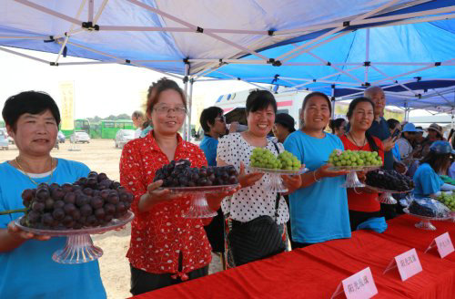 “这是户太八号,这种是阳光玫瑰,户太八号果肉嫩,口感好,阳光玫瑰甜一点,你尝尝。”果农们一边给游客介绍,一边拿起果盘,邀请大家品尝。