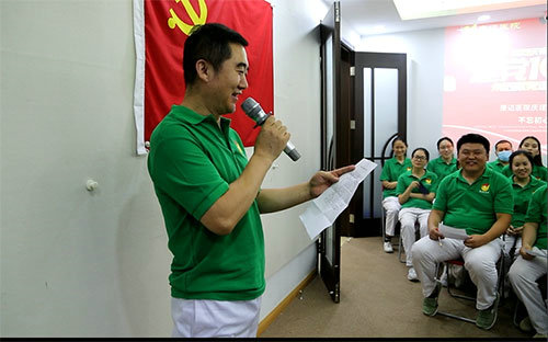 康迈党支部栗新华书记在活动致辞中表示,康迈医院发展进程中非常重视党建文化,并积极培养入党积极分子,目前康迈医院已经有多名党员。党为医院发展指明道路,因为有党和政府的大力支持,才让医院工作者有机会为更多老百姓提供医疗服务。康迈人在政府的大力支持下,必将认真践行白衣天使救死扶伤的天职,把群众的利益始终放在第一位,想群众之所想,攻克难关,争取实现百年康迈的发展愿景。康迈党支部计划在建院50周年,全院党员人数覆盖一半,到建院100周年时,全院党员实现百分之九十的覆盖。栗新华书记代表康迈党支部向建党一百周年华诞致敬,感谢中国共产党,感谢政府。康迈人始终怀着感恩的心去努力奋斗每一天,用医者仁心的大爱情怀在基层医疗事业中默默无闻再创新的辉煌成绩。