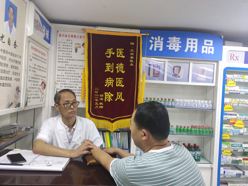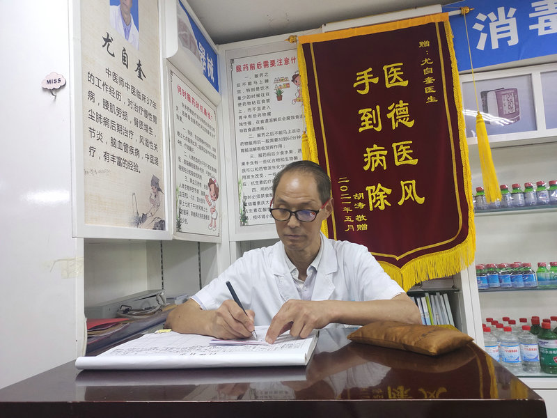 2019年尤自奎受邀来到了岚皋县朋成大药房中医堂坐诊,虽现已到古稀之年,但他对自己的要求却从未减少半分,对自己身上的责任也从未减轻半毫。“活到老就要学到老,尤其是作为一名中医大夫,中医的精髓博大精深,真的一辈子都学不完。”尤自奎讲道。