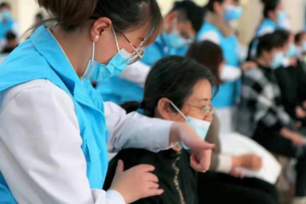 在门诊大厅正中央,由陕西中医药大学针灸推拿学院的50名研究生组成的义诊团队正在为现场来宾和患者进行推拿治疗服务,场面蔚为壮观。来自旬邑县的张大妈一边接受按摩一边说:“我这个肩周炎是老毛病了,在咱们医院推拿科看了两次,做了几次治疗就明显不疼了,咱医院大夫这本领确实大。”