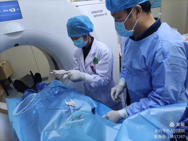 该患者今年已是88岁高龄,心脏因房颤病史,2年前于215医院施行了起搏器置入,本次突发晕厥入住市人民医院心内科,住院两天后,发做胆囊炎症状,血象1.45万,中性百分之88,C反应蛋白135,疼痛剧烈,转入肝胆科后,评估不能腹腔镜手术,请介入中心窦红卫主任和麻醉科刘金刚主任会诊,制定经皮经肝胆囊穿刺引流方案。介入手术由具有介入丰富经验的窦红卫主任亲自执针,特邀请麻醉科刘金刚主任全程监控,实施镇静镇痛措施。术中吸氧及全程心电监护,CT定位及局部浸润麻醉顺利,穿刺针穿入胆囊顺利流出墨绿色胆汁,置入引流管时患者突发心率加快,160次/分,刘金刚主任不慌不忙,自输液通路注入药物,2至3分钟即解决心率增快,再告知患者,会增大麻醉强度,此时引流管已经置入,患者不良反应在刘主任的得力处置下明显缓解。术中抽出墨绿色胆汁30余毫升,术后流出胆汁200余毫升,患者症状基本得到控制。