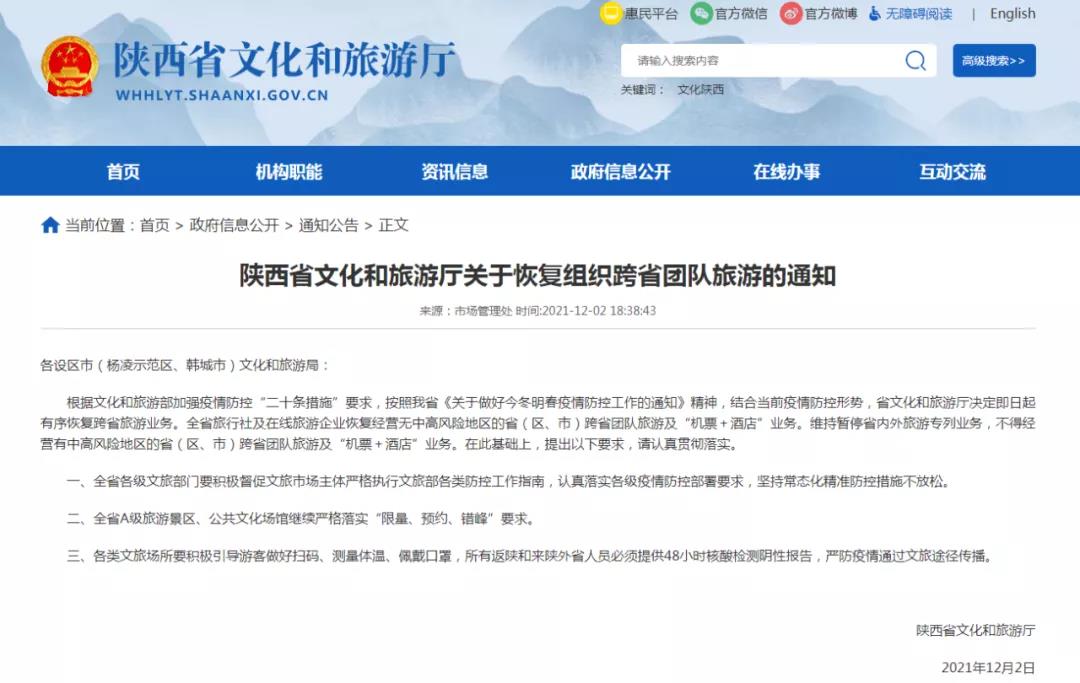 记者今天(12月2日)从陕西省文化和旅游厅获悉,即日起陕西恢复跨省旅游业务。所有返陕和来陕外省人员必须提供48小时核酸检测阴性报告。