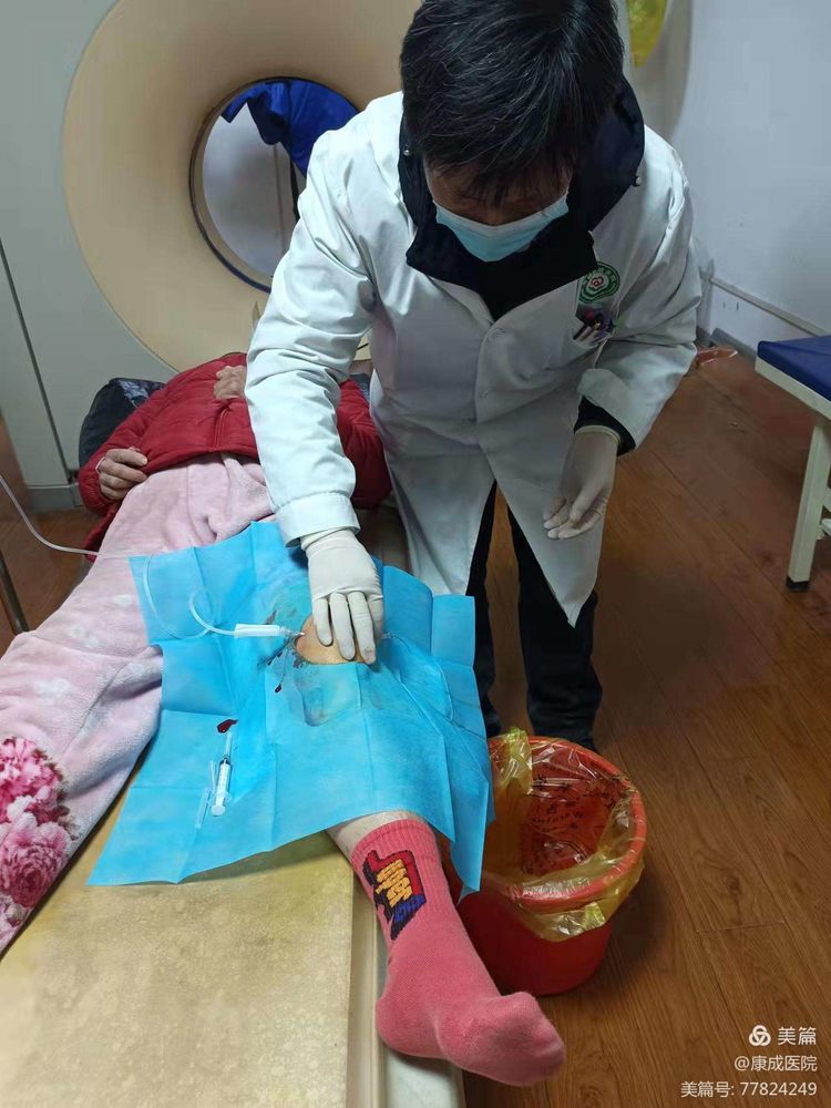 患者坐位,屈膝,小腿自然下垂,使膝关节放松。用2.5%的碘酒消毒,75%的乙醇脱碘,铺无菌巾,取髌骨下方内侧或外侧为穿刺点。用5ml注射器刺入关节腔,刺入关节腔时有突破感,注药无阻力。