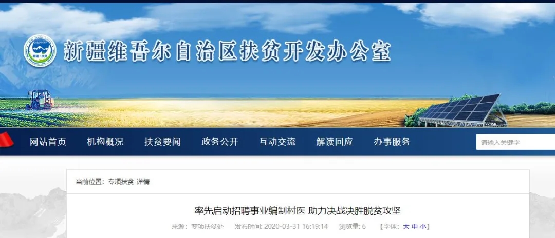 自治区卫生健康委会同自治区编办、人社厅等部门改革现行村医引入模式,在全国范围内率先启动招聘事业编制村医工作,计划2020年组织开展面向南疆四地州招聘事业编制村医专项工作,在各地乡镇卫生院空编内拿出一定计划,专项招聘一批具有一定医学学历的人员填平补齐“合格村医空白点”,实行乡村一体化管理。